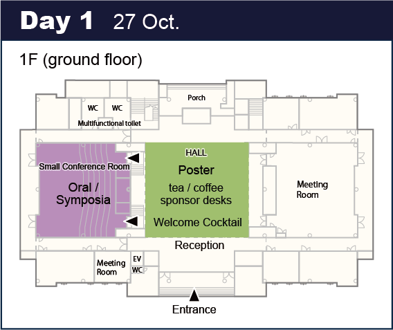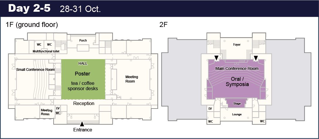 Please note that we use different rooms for oral presentations and symposia on Day 1 and Day 2-5. Please also note that the conference hall building is shared with other meetings. In the building, we do not have wifi except for Eduroam, for which you need a lincense.